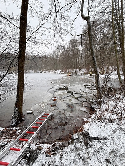 Im Übungsszenario wurde eine im Eis eingebrochene Person durch eine Puppe dargestellt. Diese konnte durch das Zusammenspiel der eingesetzten Kräfte zügig und sicher aus dem Gefahrenbereich gerettet werden. Anschließend wurde der gesamte Ablauf gemeinsam nachbesprochen.