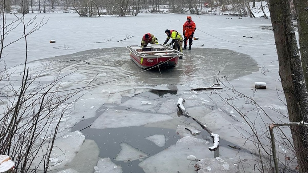 Im Übungsszenario wurde eine im Eis eingebrochene Person durch eine Puppe dargestellt. Diese konnte durch das Zusammenspiel der eingesetzten Kräfte zügig und sicher aus dem Gefahrenbereich gerettet werden. Anschließend wurde der gesamte Ablauf gemeinsam nachbesprochen.