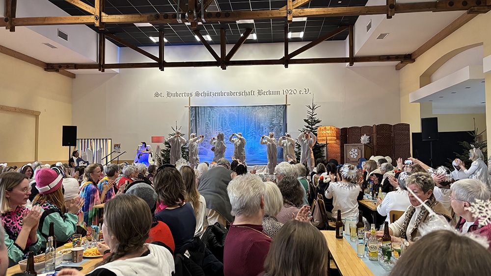 Sechs engagierte Frauengruppen probten die letzten Wochen fleißig, um diesen Nachmittag ganz besonders zu gestalten und die rund 150 Frauen, welche zum Karneval feiern erschienen sind, zu unterhalten. Ob Jung oder Alt, in dem breit gefächerten und vielseitigen Programm, bestehend aus Tanz, Comedy und Sketchen, war für jeden was dabei. Nach einem ausgewogenen Kuchenbuffet und neben zahlreichen Getränken – von Kaffee, über Tee, bis hin zu alkoholischen Erfrischungen und Softdrinks – begann das Programm mit der U16-Tanzgarde Volkringhausen. Auch die Ü16-Gruppe des Tanzvereins lieferte zwischen den zahlreichen freiwilligen Beckumerinnen einen bemerkenswerten Auftritt ab.