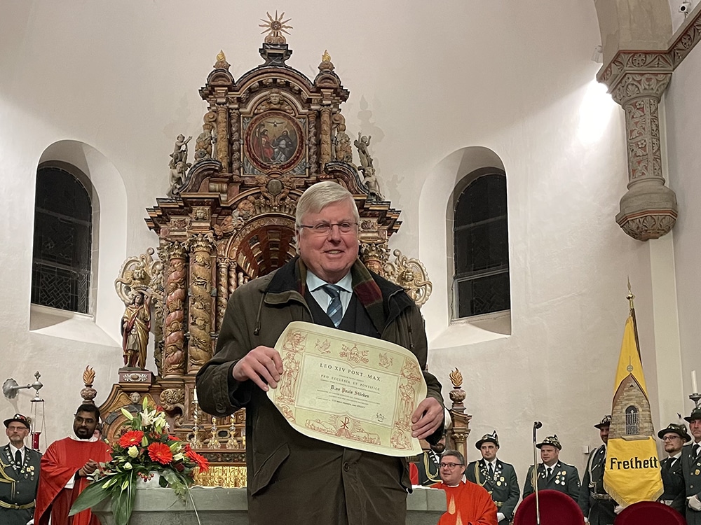 Ebenfalls ausgezeichnet wurde der praktizierende Landarzt Paul Stüeken, der sich seit über 40 Jahren ehrenamtlich in Balve, unter anderem als Vorsitzender des Musikvereins, engagiert. Seit 1997 gehörte er dem Kirchenvorstand von St. Blasius an, von 2009 bis 2012 war er stellvertretender geschäftsführender Vorsitzender. Nach mehr als 25 Jahren unermüdlichen Einsatzes verließ er im November vergangen Jahres den Kirchenvorstand. In seine Amtszeit fielen zahlreiche Großprojekte sowie für die Gemeinde herausfordernde Phasen, wie etwa die Auflösung des Krankenhauses oder die langwierige Suche nach einem neuen Träger für das St.-Johannes-Altenheim. „Paul Stüeken erwies sich dabei stets als starke Persönlichkeit, die mit Lebenserfahrung, Menschenfreundlichkeit und Autorität Brücken baute und die Kirche vor Ort stärkte.“ Darüber hinaus engagiert er sich seit vielen Jahren als Kommunionhelfer und Lektor und genießt in der gesamten Gemeinde hohes Ansehen