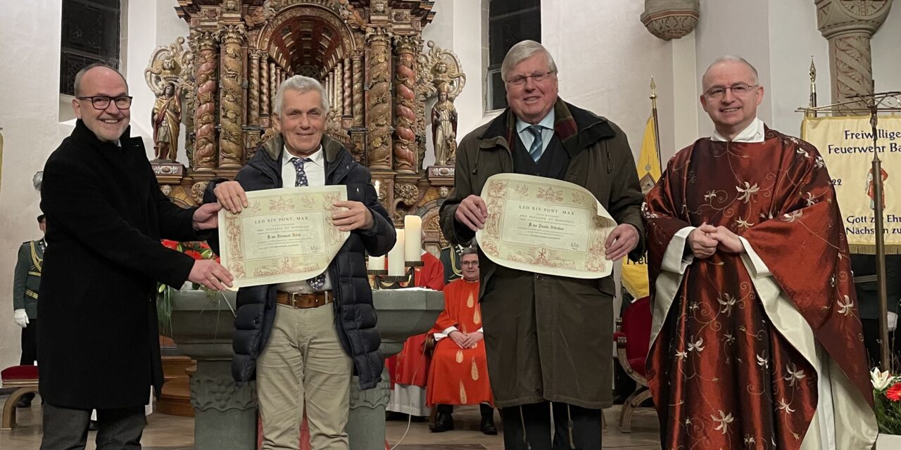 Ein besonderer Höhepunkt des Festhochamtes waren zwei Ehrungen für langjähriges und herausragendes ehrenamtliches Engagement. Dechant Andreas Schulte hatte für Bruno Köck und Dr. Paul Stüeken die päpstliche Auszeichnung „Pro Ecclesia et Pontifice“ beantragt.