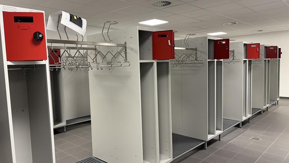 Die Raumgrößen der Ankleide und der sanitären Einrichtungen orientieren sich nämlich an der Anzahl der Einsatzkräfte: Die Umkleiden sind für etwa 45 männliche Feuerwehrleute ausgelegt, zusammen mit den Damen können mehr als 60 Einsatzkräfte untergebracht werden. Eine ganz wichtige Rolle spielt hierbei auch die Schwarz-Weiß-Trennung: Nach einem Einsatz dürfen die Feuerwehrleute nämlich nicht direkt in die Umkleiden gehen. Um das Gerätehaus möglichst sauber und ordentlich zu halten, stehen zunächst eine Stiefelwäsche und das Ausziehen verschmutzter Anzüge an. Ergänzt wird dies durch getrennte Sanitärbereiche für Damen und Herren.