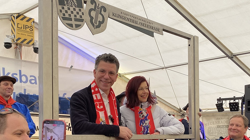 Neuenrade. Zum 35-jährigen Jubiläum der Städtepartnerschaft hat die Stadt Klingenthal der Stadt Neuenrade einen begehbaren Fotorahmen geschenkt.