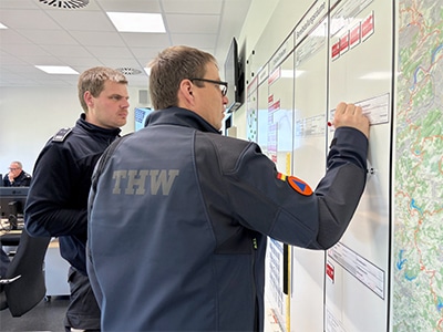 Dennis Naudit vom THW Lüdenscheid erklärt: „Das THW bringt dabei spezielle Fähigkeiten und Technik ein – etwa bei der Logistik, beim Materialtransport oder bei der Energieversorgung. Aber Technik allein reicht nicht. Wenn das Wasser kommt, muss teamübergreifend jeder Handgriff sitzen. Solche Übungen machen uns im Einsatzfall besser.“