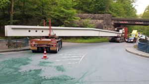 Der liegengebliebene Schwertransporter auf der B 515. Foto: Polizei MK