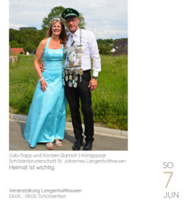 Langenholthausen. (R.E.) Auf dem 159. Kalenderblatt des Balver Heimatkalenders 2020 macht das sympathische Königspaar aus Langenholthausen, Karsten Bartsch und Gabi Rapp, gute Miene zum bösen Spiel. Denn bis nach dem Vogelschießen am Montagmorgen sollten sie eigentlich im Mittelpunkt des diesjährigen Schützenfestes stehen.