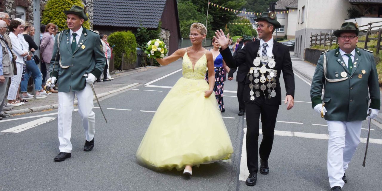 Selten waren in den vergangenen Jahren so viele Menschen an den Straßen beim Festzug in Beckum wie am heutigen Nachmittag, als sich das Königspaar Karsten und Sandra Beckmann mit seinem Hofstaat im farbenprächtigen Festzug präsentierte. Die musikalische Untermalung beim Marsch durch das Dorf in Richtung Schützenhalle erfolgte durch die Musiker aus Drolshagen, Müschede und Eisborn. Auch die Jungschützen waren mit ihrem König Jannik Gajk und das Kinderkönigspaar Ali und Angelina waren im Festzug präsent.