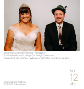 Garbeck. (R.E.) Auf dem 194. Kalenderblatt des Balver Heimatkalenders 2020 ist ein Königspaar zu sehen, dessen Regentschaft eigentlich am heutigen Montag enden sollte. So wäre es auch gekommen, wenn die Schützenbruderschaft Hl. Drei Könige Garbeck heute einen neuen Regenten unter der neuen Vogelstange ermittelt hätte.