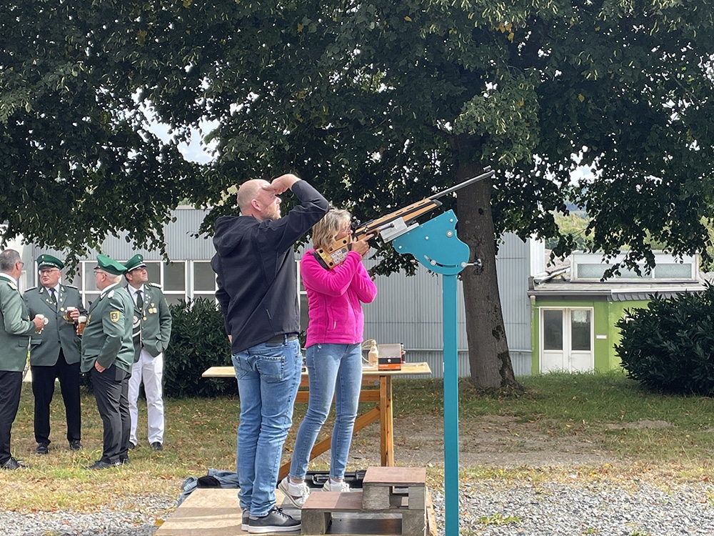 Im Anschluss an die alljährliche Schützenabrechnung startete pünktlich um 15 Uhr der Wettbewerb – von da an verfolgten die Zuschauer gespannt das Schießen. Nach dem 82. Schuss fiel die letzte der sechs kleinen Insignienflaschen, ehe es mit Patronenwechsel an die große Holz-Bierflasche ging. Mit dem 127. Schuss holte schließlich Martin Völkner das hölzerne Ziel herunter und sicherte sich damit den Orden des Tages.