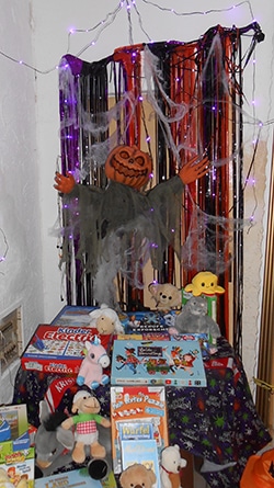 Schon von außen ist jedem klar, dass hier auch in diesem Jahr eine Halloweenparty steigen wird. Da die Veranstaltung sich in erster Linie an Kinder richtet, gibt es erstmals eine Geschenkeecke, wo sich die kleinen Geister bedienen dürfen.