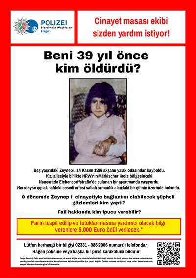 Neuenrade. In der Nacht vom 14. auf den 15. November 1986 wurde die damals fünfjährige Zeynep I. in Neuenrade Opfer eines Kapitalverbrechens. Bis heute konnte der Täter nicht ermittelt werden. Trotz des lang zurückliegenden Zeitraums bleibt die Aufklärung der Tat weiterhin das Ziel einer Mordkommission.