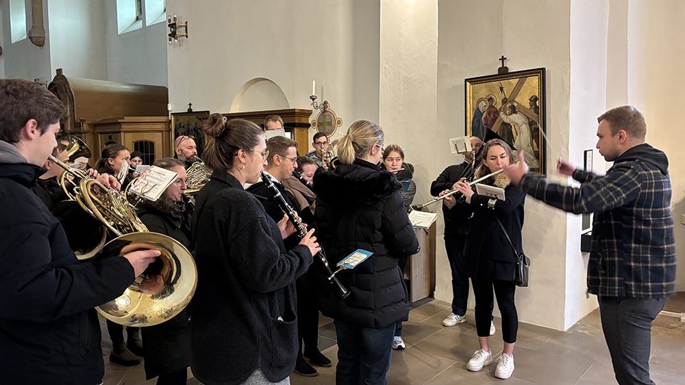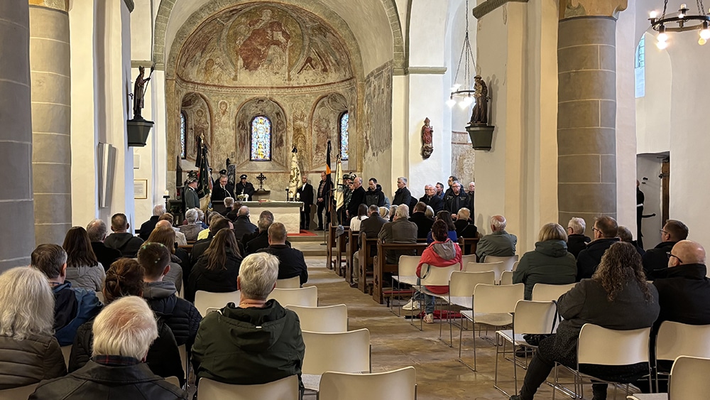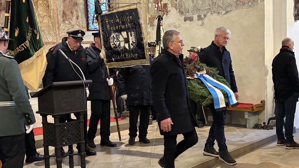 Dechant Andreas Schulte meldete sich schließlich zu Wort. Denn auch er möchte den Frieden auf der Welt wahren und scheut davor zurück, die Fehler unserer Vorfahren in der Vergangenheit zu wiederholen. Da ihm durchaus bewusst ist, dass ein Mensch alleine nicht den Weltfrieden sichern kann, betonte er, dass auch kleine, unscheinbare Einsätze für den Frieden oder für Bedürftige, eine riesige Wirkung haben können. Schlussendlich bedankte er sich auch bei den Beteiligten und engagierten Teilnehmerinnen und Teilnehmern an diesem besonderen Tag. Dazu zählten die Freiwillige Feuerwehr Balve, der Männerchor 1874 Balve, welcher die Feier mit Gesang eröffnete und begleitete, der Musikverein Balve, welcher für die musikalische Begleitung des Gottesdienstes und die Beendigung der Gedenkfeier durch die Nationalhymne zuständig war, sowie die Schülerinnen der Städtischen Realschule Balve, welche zum Denken anregende Gedichte vortrugen.