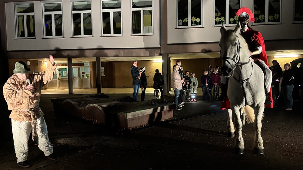 So wie jedes Jahr wurde gespielt, wie der römische Soldat Martin seinen roten Mantel in einer Winternacht mit dem armen Bettler teilt, welcher in seinen Lumpen friert. Zitterig und verzweifelt verkörperte Markus Stracke diese Rolle, um den Kindern ein lehrreiches Schauspiel vorzuführen und ihnen gemeinsam mit dem heiligen Mann die Wichtigkeit des Mitgefühls und der Solidarität zu vermitteln.