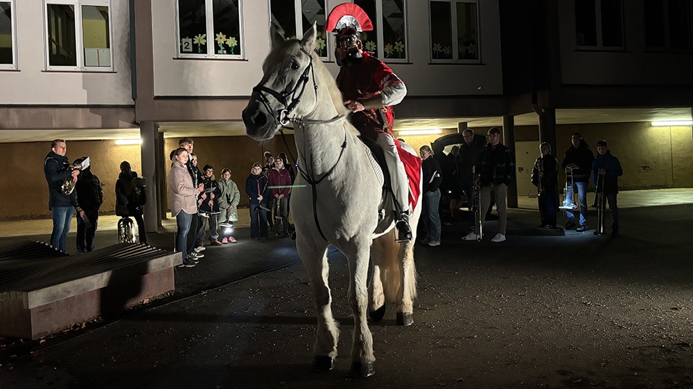 Balve. Am Dienstagabend ritt Sankt Martin auf seinem hohen, weißen Ross durch die Balver Innenstadt. Klein und Groß trafen sich an der Sankt-Blasius-Kirche und folgten der Imitation des Heiligen Schutzpatrons mit zahlreichen Laternen, welche die Stadt letztlich zum Leuchten brachten. Gemeinsam mit dem Musikverein Balve, wurde auf dem langen Zug durch die Stadt musiziert und gesungen, sodass nicht nur für ein großes Aufsehen gesorgt wurde, sondern der römische Soldat und seine Geschichte wurden an diesem Abend besonders in Ehren gehalten. Das Ziel, welches nach dem Zuge angestrebt wurde, war der Schulhof der Gemeinschaftsgrundschule St. Johannes in Balve. Dort wurde für die Kinder das bekannte Martinsspiel inszeniert.