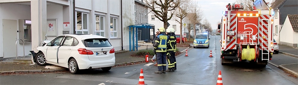 Die Kräfte der Löschgruppe Affeln sicherten die Unfallstelle, stellten den Brandschutz sicher und streuten auslaufende Betriebsmittel mit Ölbinder ab. Anschließend wurden noch der Gehweg und der Bereich vor dem Geldautomaten von Trümmerteilen und Scherben gereinigt. Ein Verantwortlicher des Gebäudes war vor Ort und prüft nun den Gebäudeschaden.
