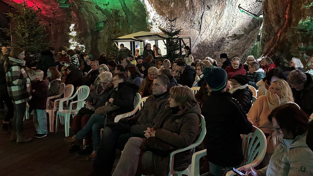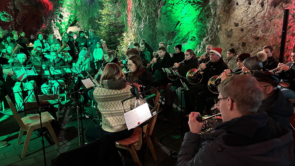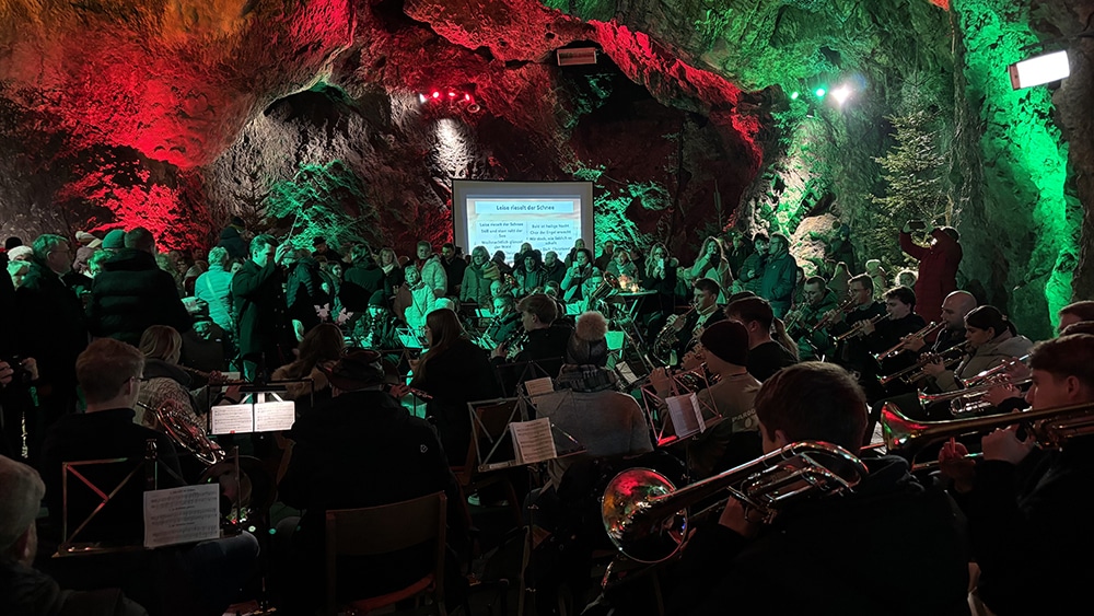 Balve. Am Samstagabend luden die St.-Sebastian-Schützenbruderschaft und der Musikverein Balve bereits zum vierten Mal zum Weihnachtsliedersingen in die Balver Höhle ein. Nachdem die Jugend- und Gemeindereferenten der Kirchengemeinden Balve, Doreen Wahl und Theresa Wagner, gemeinsam mit den Kindern einige weihnachtliche Kinderlieder anstimmten, folgte der große Auftritt des Balver Hauptorchesters. Unter der Leitung ihres Hauptdirigenten Philipp Cramer spielten sie bis zum späten Abend zahlreiche, sogar internationale Weihnachtslieder und ermutigten die zahlreich erschienenen Gäste zum gemeinsamen Singen.